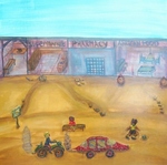 2003Opdracht was oude muur te schilderen. Tijdens het schilderen vond ik een krantenfoto en ben daar toen mee aan de slag gegaan omdat ik het beeld zo pakkend vond.